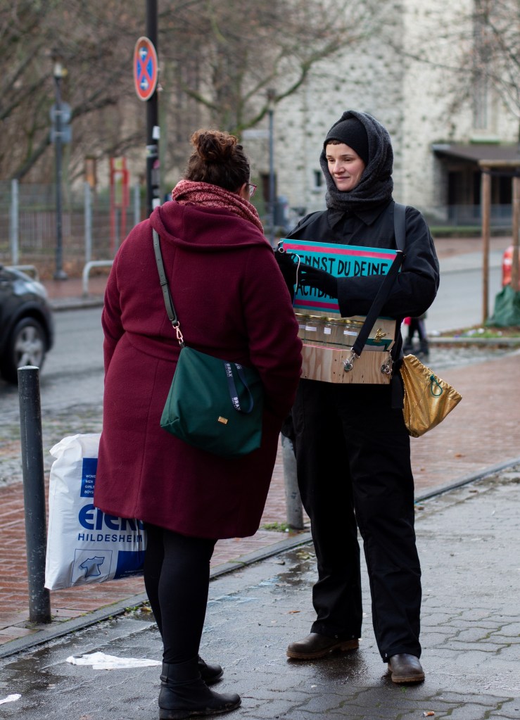 Das Künstler:innenkollektiv MINKUS LYS lädt zu der künstlerischen Bedarfsanalyse HAST DU FRAGEN?? ein: Hier kann über Wünsche und Bedürfnisse im Wohnumfeld und darüber hinaus gesprochen werden. Es entsteht ein direkter und indirekter Austausch zwischen den Teilnehmenden.